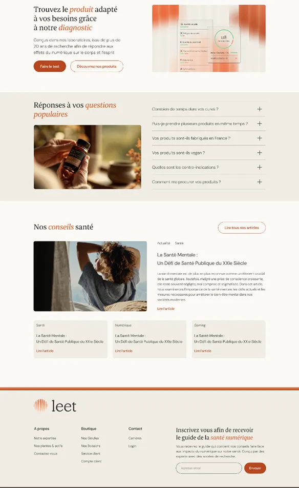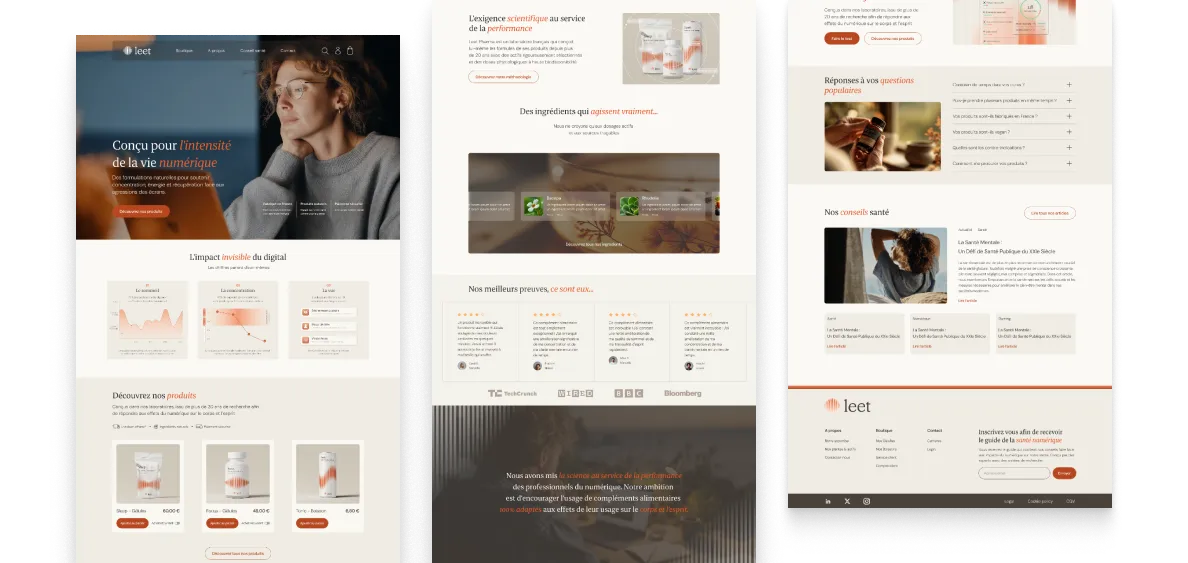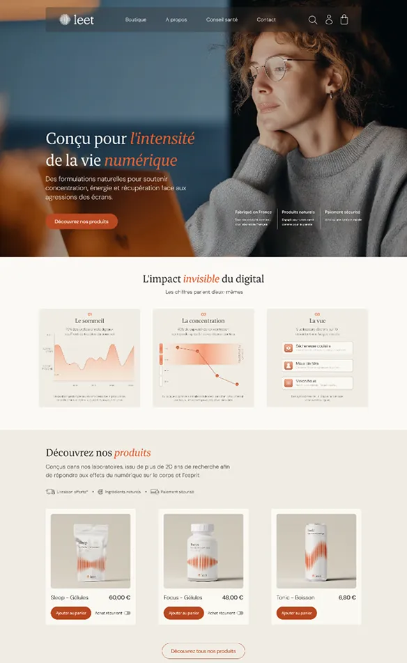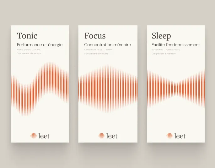 Une identité inspirée des rythmes biologiques et des ondes vitales. Logo en forme de sphère organique, palette terracotta chaleureuse, packaging avec motifs d'ondes spécifiques à chaque produit. Un système visuel qui respire : scientifique mais humain, performant mais naturel.